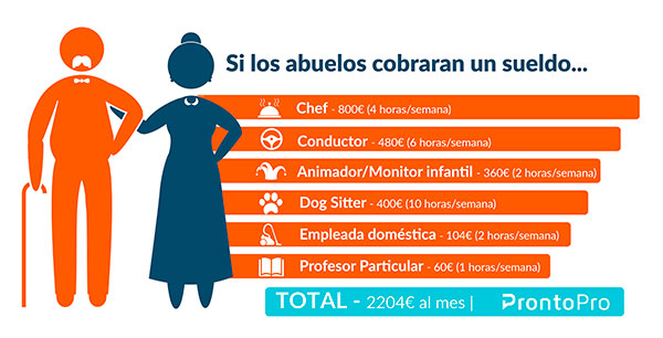 Para calcular el salario medio, el portal Prontopro.es ha tenido en cuenta el precio de algunas de las actividades que día a día realizan los abuelos, tales como cocineros, animadores, conductores, dog sitter, profesores particulares y empleados domésticos.