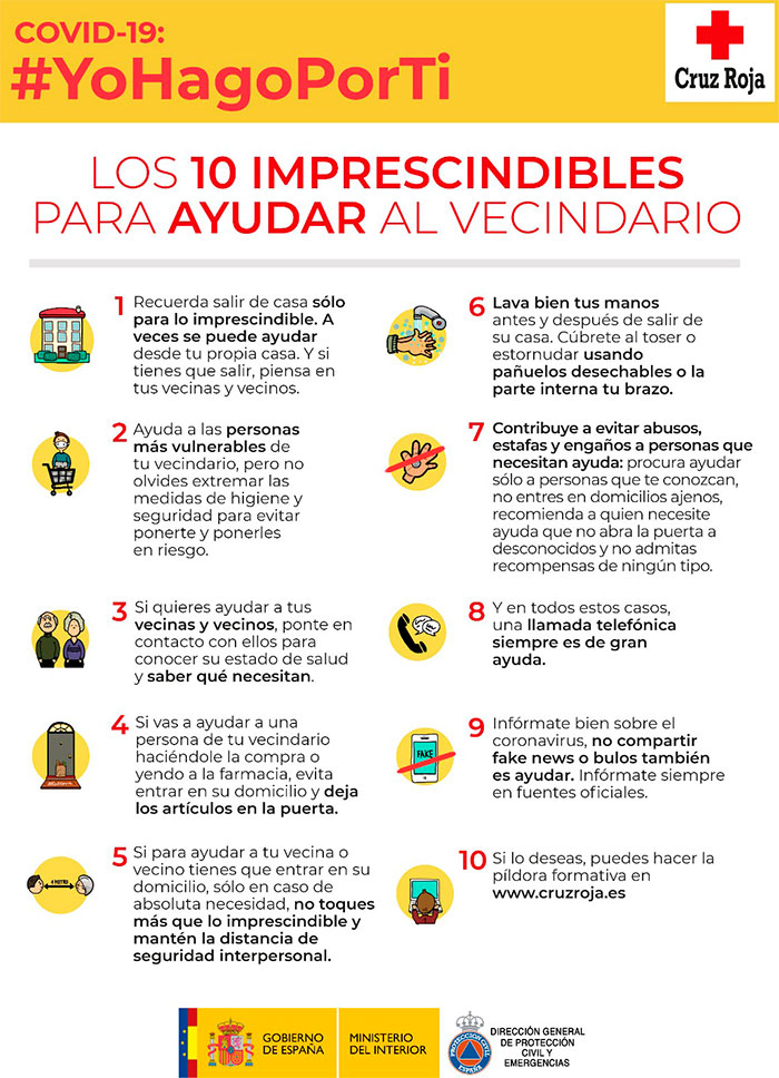 La Dirección General de Protección Civil y Emergencias, en colaboración con Cruz Roja Española, ha lanzado la Campaña YoHagoPorTi, dirigida a impulsar conductas que fomenten la solidaridad con los vecinos que son más vulnerables ante la pandemia generada por el COVID-19: personas mayores, enfermas o con discapacidad.