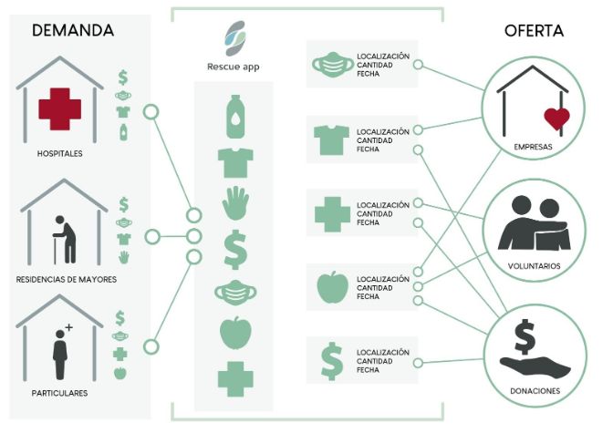 Con este espíritu se pone en marcha la plataforma sin ánimo de lucro Rescue app, formada en la actualidad por 18 voluntarios altruistas que se dedican a poner en contacto y canalizar la oferta y la demanda de las necesidades a nivel nacional. Se trata de un movimiento social y un proyecto que se refleja en un equipo humano que busca fomentar entre la ciudadanía la solidaridad, así como contribuir, sensibilizar y ayudar a solucionar problemas de emergencia social.