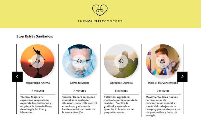 The Holistic Concept es una plataforma tecnológica y metodológica dirigida a la gestión del estrés que ha desarrollado 117 contenidos online, en formato vídeo y audio, que duran de 2 a 15 minutos y que también imparte sesiones presenciales.