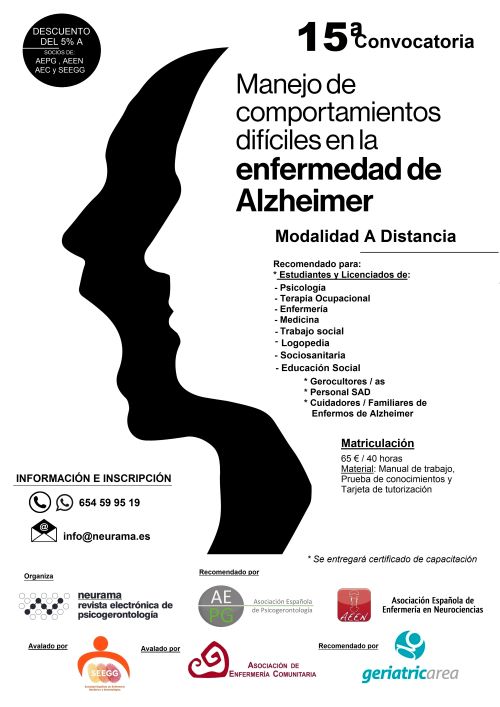 El curso especializado a distancia «Manejo de comportamientos difíciles en la enfermedad de Alzheimer», que alcanza su decimoquinta edición, realiza un recorrido teórico y práctico por las principales conductas difíciles habituales en pacientes con Alzheimer.