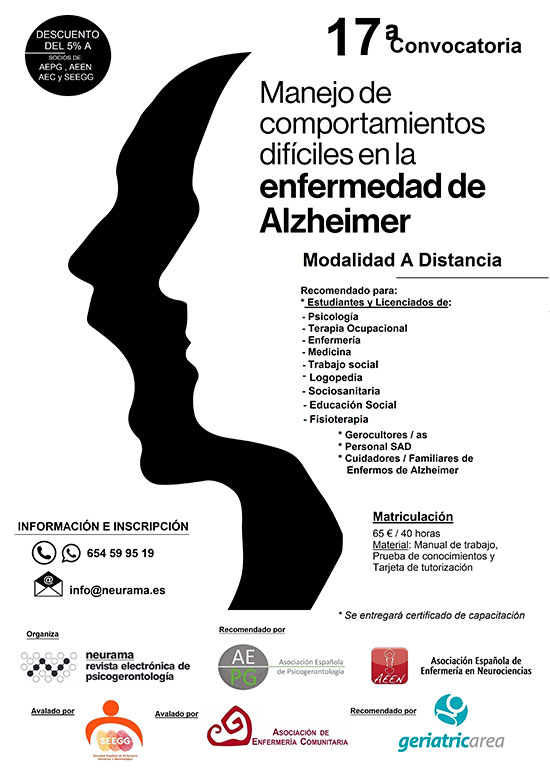 Ya está abierta una nueva convocatoria, la decimoséptima, del curso especializado a distancia «Manejo de comportamientos difíciles en la enfermedad de Alzheimer», que realiza un recorrido teórico y práctico por las principales conductas difíciles habituales en pacientes con Alzheimer.