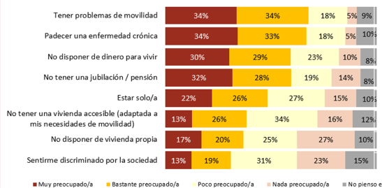 Los datos recopilados por el estudio “Preocupaciones ante una próxima vejez” revelan que las situaciones que más preocupan a los españoles son tener problemas de movilidad (68%), padecer una enfermedad crónica (67%) y no disponer de dinero para vivir (59%). Además, la accesibilidad de la propia vivienda es prioritaria, pero el 51% de las viviendas están poco o nada adaptadas.