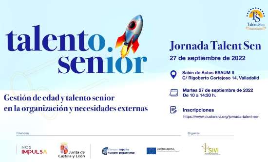 La Jornada Final del Proyecto Comunidad Talent-Sen, impulsado por Clúster SIVI, se celebrará de forma presencial el próximo 27 de septiembre en el Salón de Actos ESAUM III de Valladolid bajo el título «Ecosistema Talento senior. Red de inspiración».