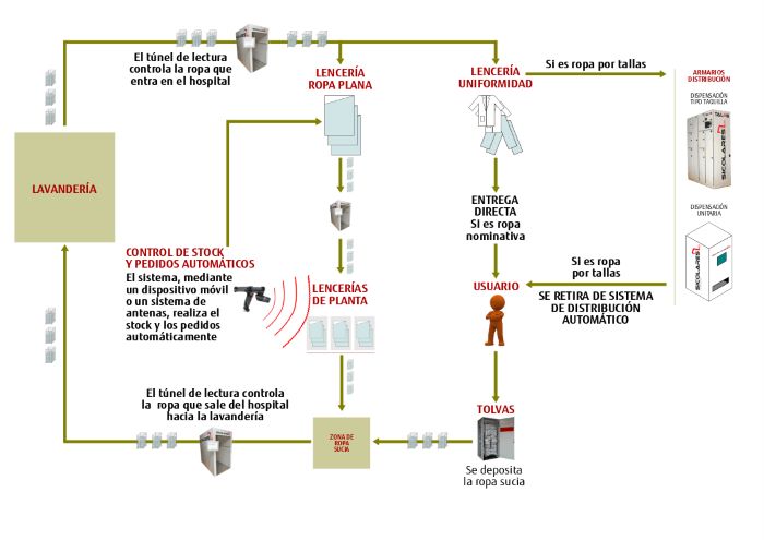 El sistema SicoLares Higia de Fujitsu permite la identificación unívoca de cada prensa de ropa y lavandería de los hospitales y residencias, gracias a la completa trazabilidad de cada prenda mediante potentes chips (o tag) de radiofrecuencia UHF y otra serie de equipos.