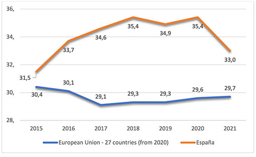 Población con discapacidad en riesgo de pobreza o exclusión social, en España y la Unión Europea, 2015-2021