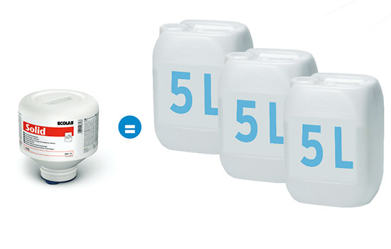 Otra novedad de Ecolab es el Sistema Solid para lavavajillas, una gama de productos de alto rendimiento para todo tipo de aguas que se presentan en cápsulas de 4,5 kg. Se trata de productos seguros para la limpieza de metales y de gran rendimiento: una cápsula de Solid equivale hasta 15 litros de detergente tradicional, garantizando el 100% vaciado de la cápsula.