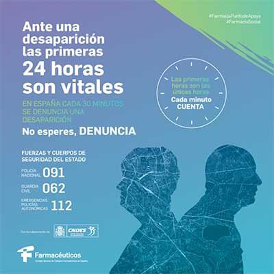 Con el objetivo de sensibilizar e informar a la población en general, y a los farmacéuticos, en particular, sobre la importancia de denunciar de inmediato cuando se produce una desaparición, el Consejo General de Colegios Farmacéuticos, en colaboración con el Centro Nacional de Desaparecidos (CNDES), ha puesto en marcha la campaña “Cada minuto cuenta”.