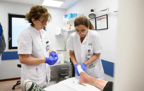 En la imagen, Sonia Riera (a la derecha) realizando una cura a un paciente en la Unidad de Heridas del hospital. Foto: Francisco Ávia