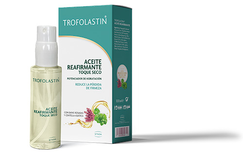 Para combatir estos efectos, Trofolastín Aceite Reafirmante Toque Seco, de textura sedosa de rápida absorción y agradable fragancia, dispone de un alto contenido en aceite de bayas rosadas (Schinus terebinthifolia) y Centella asiática, que estimula la producción de colágeno y elastina, aumentando la elasticidad y la firmeza cutánea.