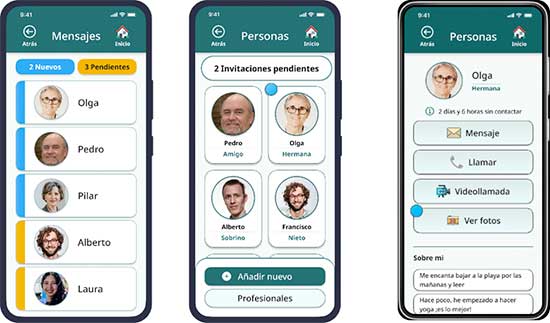 Los usuarios pueden enviar y recibir mensajes de texto, voz e imágenes con familiares y cuidadores en una interfaz sencilla y fácil de manejar.