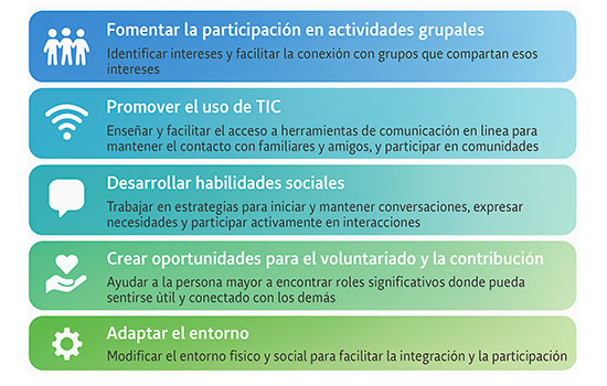 - La promoción del ocio y la participación social identifica y facilita la participación en actividades de ocio placenteras y significativas, creando oportunidades sociales que combaten la soledad y promueven la conexión social.
