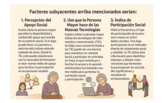 La escala proporciona una puntuación total que clasifica el nivel de soledad social en distintos niveles (bajo-medio-alto) para comprender la intensidad del sentimiento de soledad que experimenta la persona mayor. Esta información es fundamental para el terapeuta ocupacional, ya que un nivel alto de soledad social puede ser un factor subyacente que impacta negativamente en la participación en diversas ocupaciones. - 2. Exploración de los Factores Subyacentes: