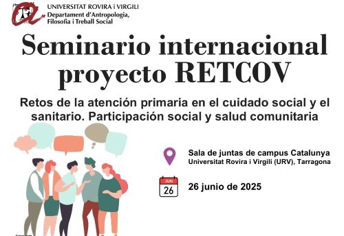 El 26 de junio se celebrará el Seminario Internacional Proyecto RETCOV ‘Retos de la atención primaria en el cuidado social y sanitario. Participación social y salud comunitaria’, organizado por el Departamento de Antropología, Filosofía y Trabajo Social de la Universitat Rovira i Virgili de Tarragona. El programa es el siguiente: