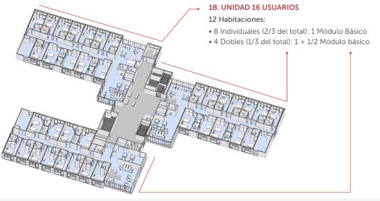 Esto permite desarrollar agrupaciones que se configura con 3 unidades de habitaciones, dobles e individuales, con un espacio central de conexión que sirve a su vez de área de comunicación y control. Mediante la agrupación de distintas unidades las posibilidades son casi infinitas permitiendo ajustarse a las necesidades específicas de cada caso concreto, dando una respuesta óptima para cualquier modelo de residencia de mayores.