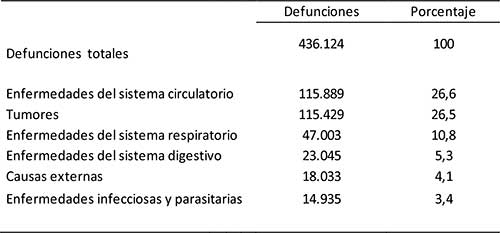 Las defunciones por tumores en 2023 experimentaron un ligero ascenso con respecto a 2022 (0,5%). Las defunciones por enfermedades del sistema respiratorio en 2023 también aumentaron en relación a 2022 (9,2%), debido, sobre todo, al aumento de defunciones por neumonía e influenza. El resto de las principales causas de muerte descendieron en 2023 con respecto a 2022, siendo de gran magnitud la disminución de las defunciones por enfermedades infecciosas y parasitarias (61,3%), básicamente, por la disminución de las defunciones por COVID-19.