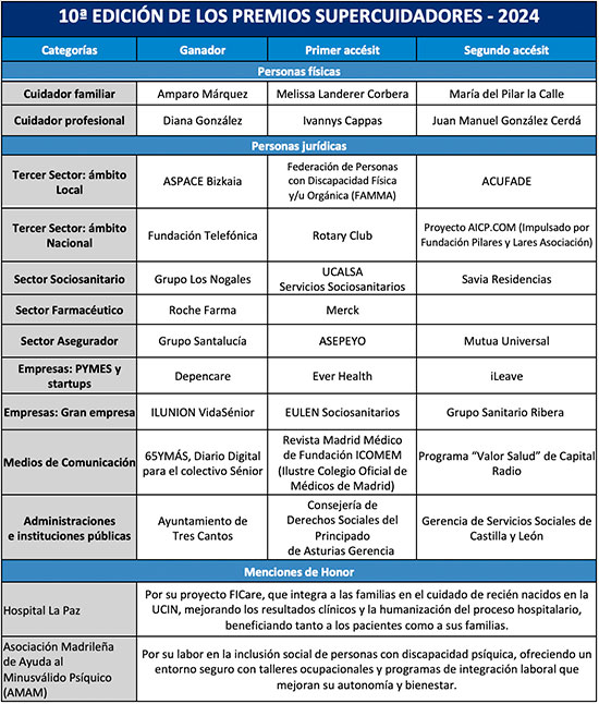 […] Los premios se fallarán el 14 de octubre y serán comunicados y entregados en un acto que tendrá lugar en Madrid el 31 de octubre. Los premiados en la 10ª Edición de los Premios SUPERCUIDADORES pueden consultarse aquí. […]
